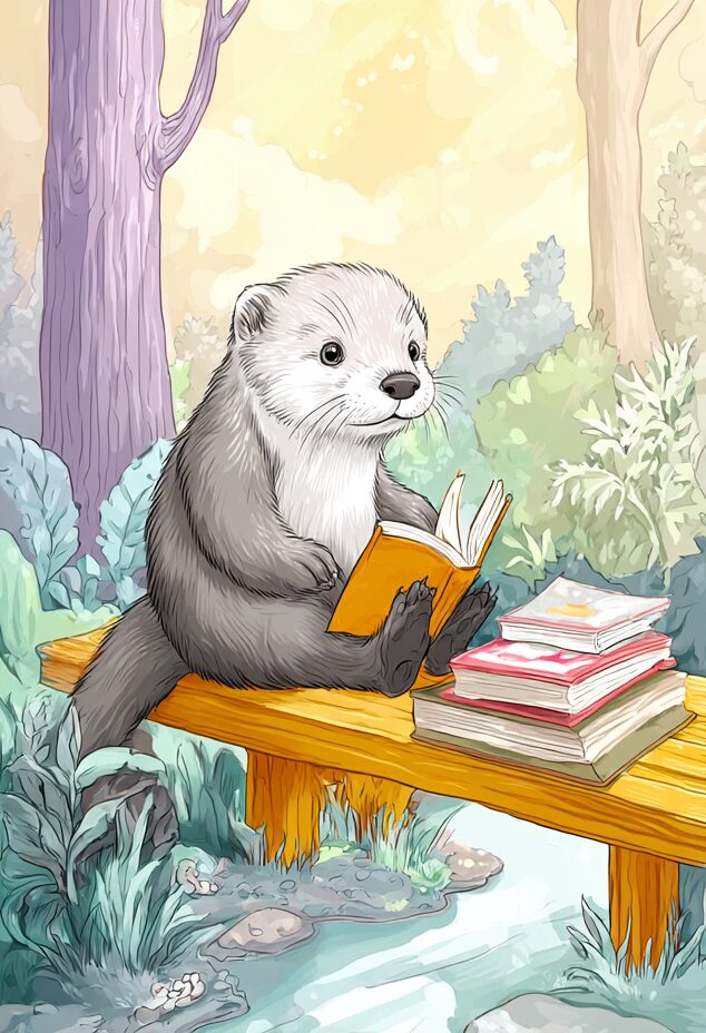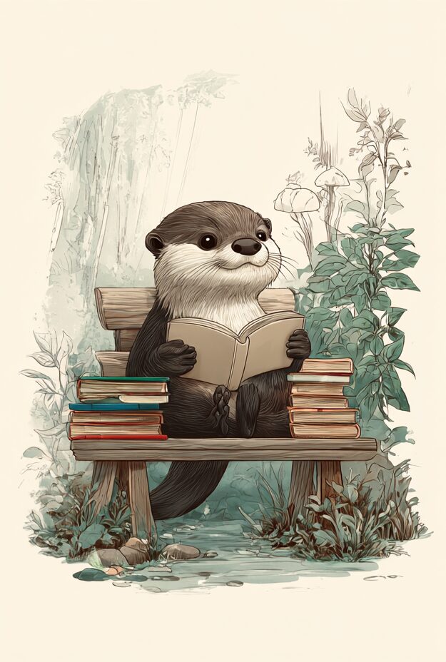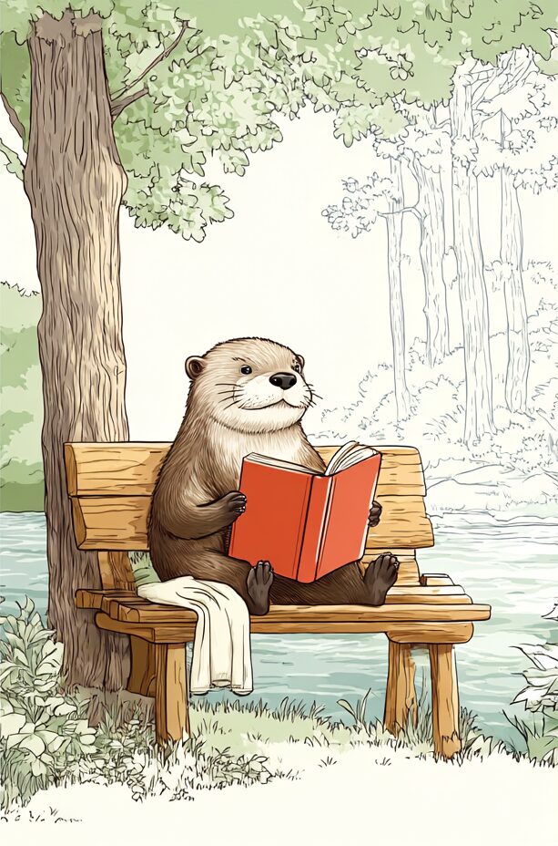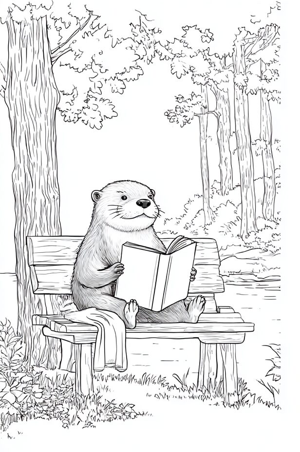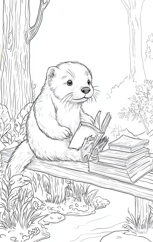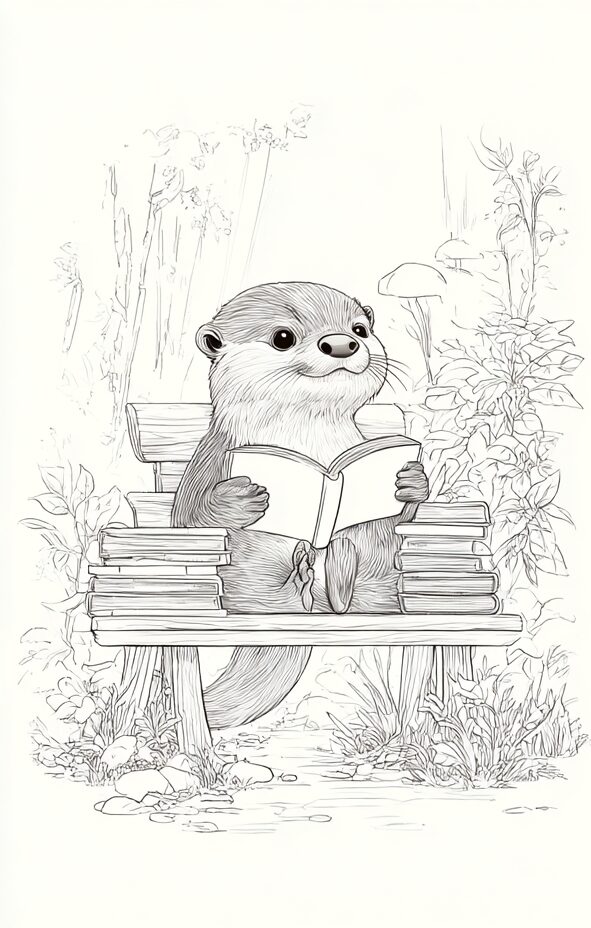 無料塗り絵:読書をするカワウソ(大人の塗り絵)