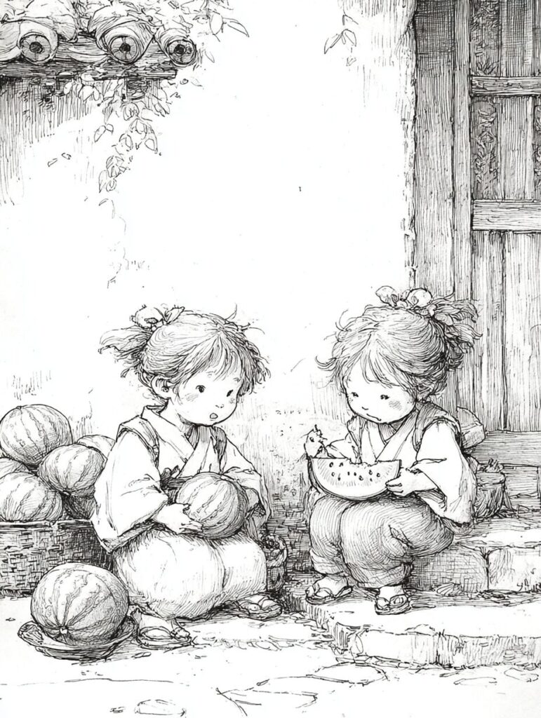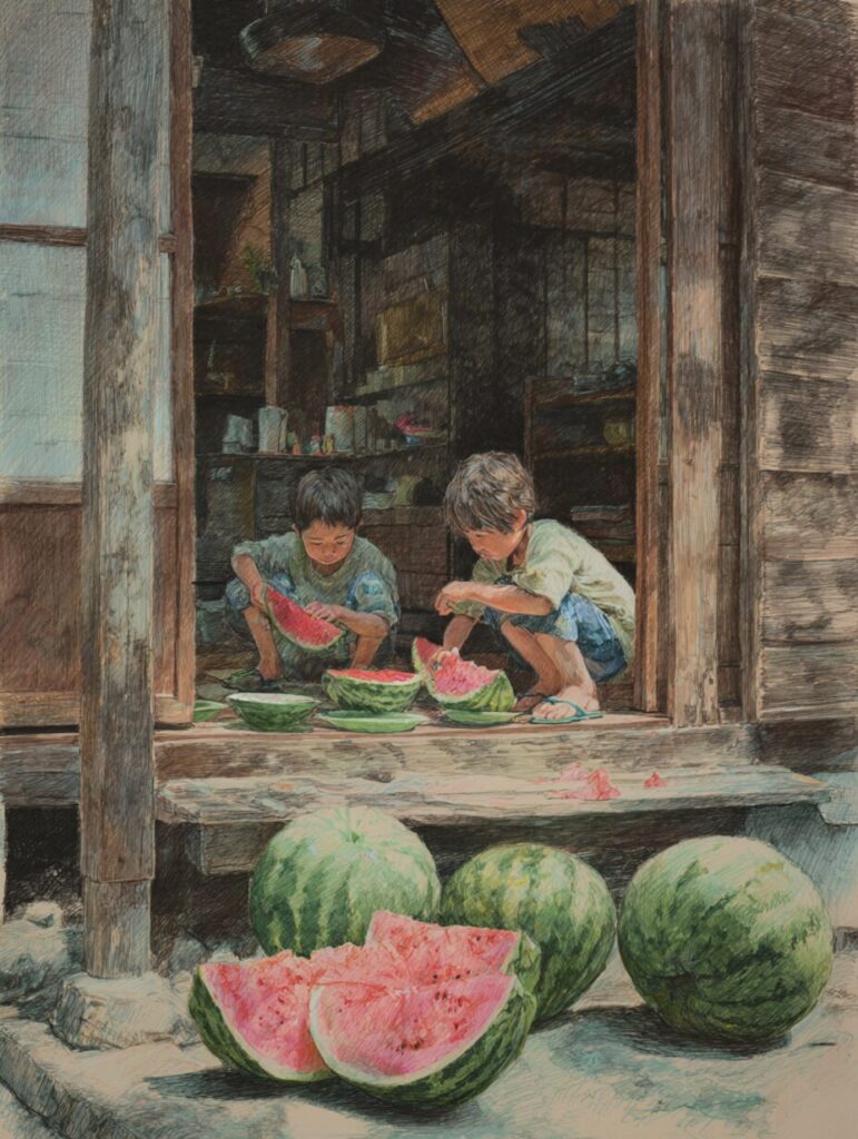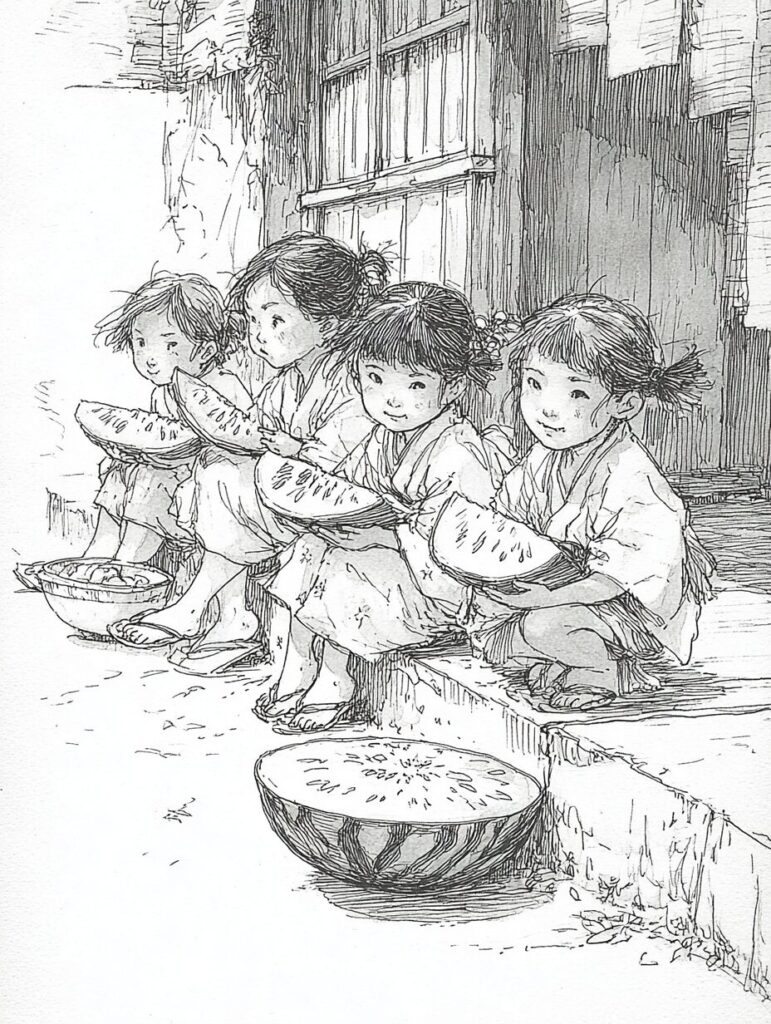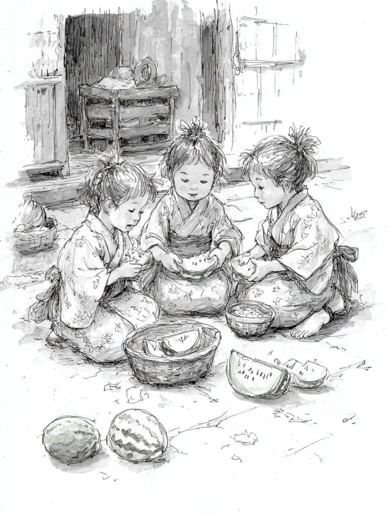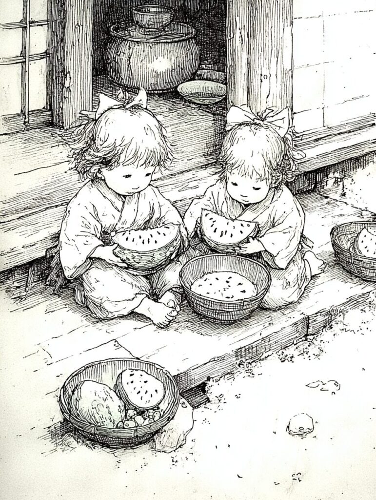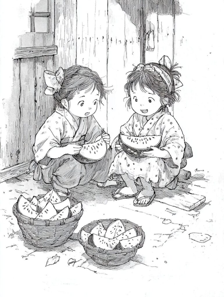 無料塗り絵:スイカを食べている風景(レトロ)(大人の塗り絵)