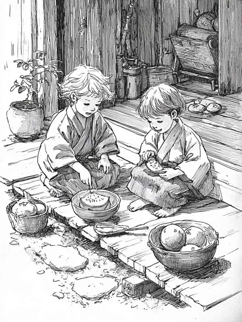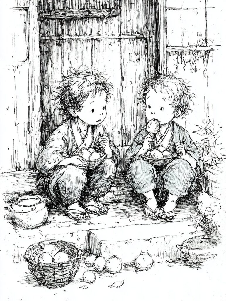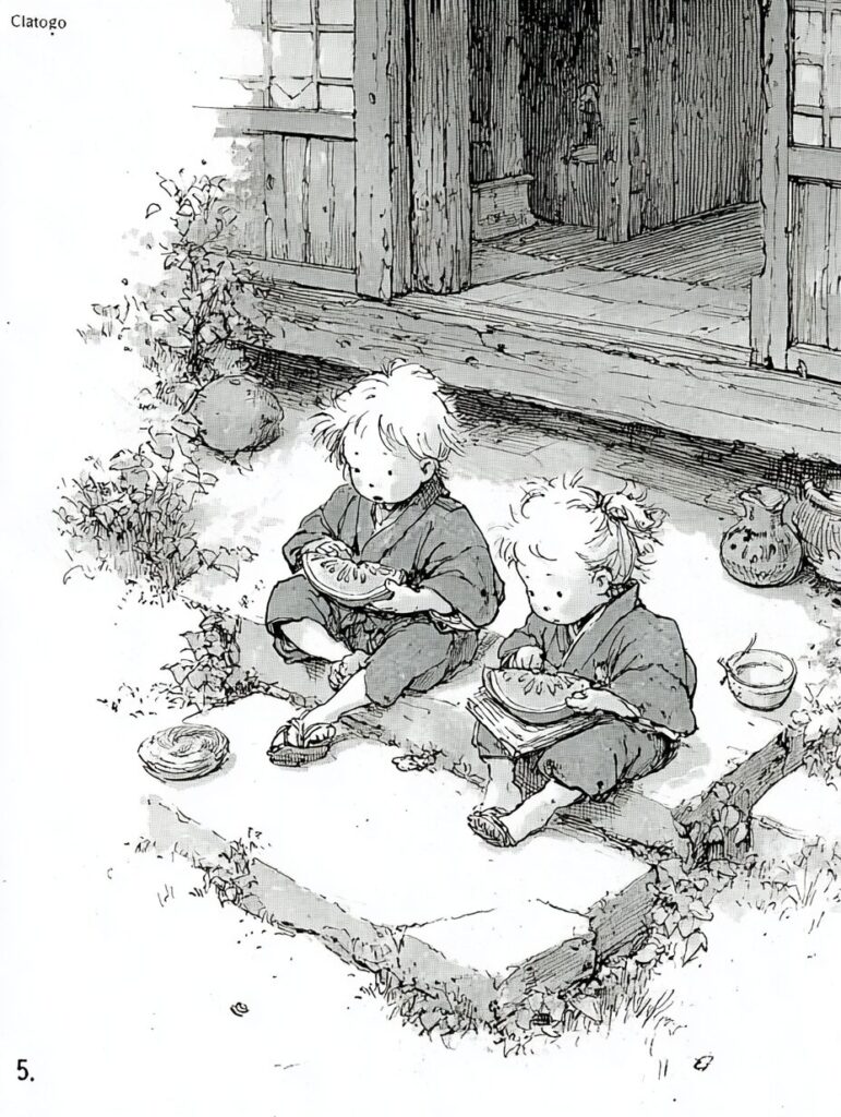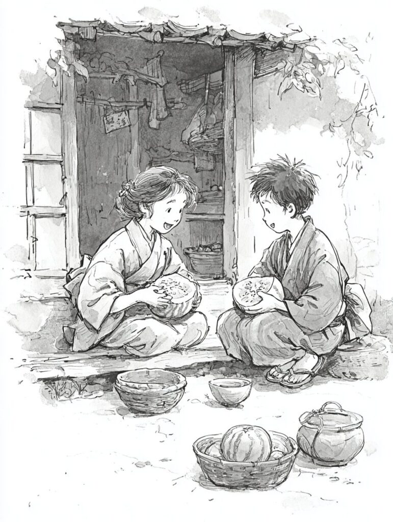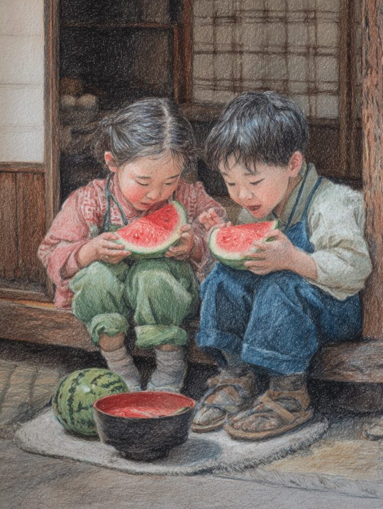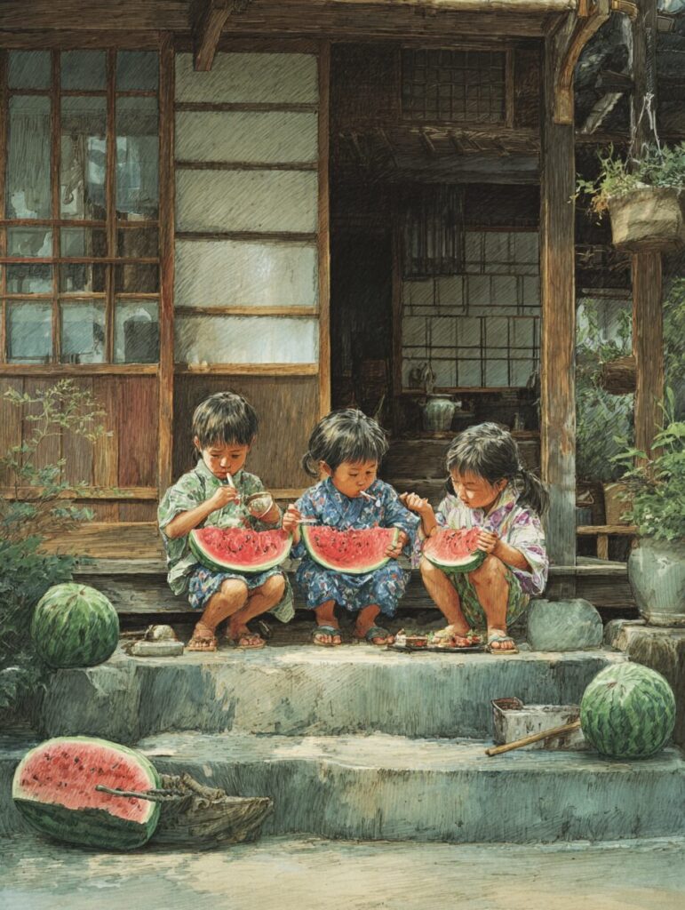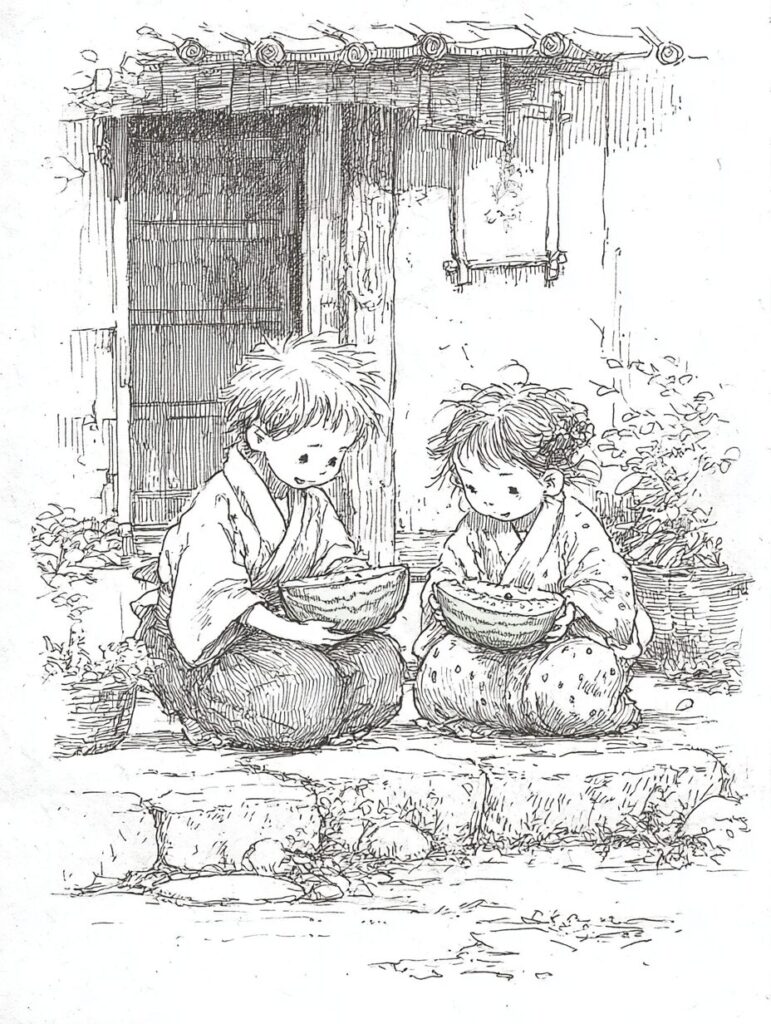 無料塗り絵:スイカを食べている風景(レトロ)(大人の塗り絵)