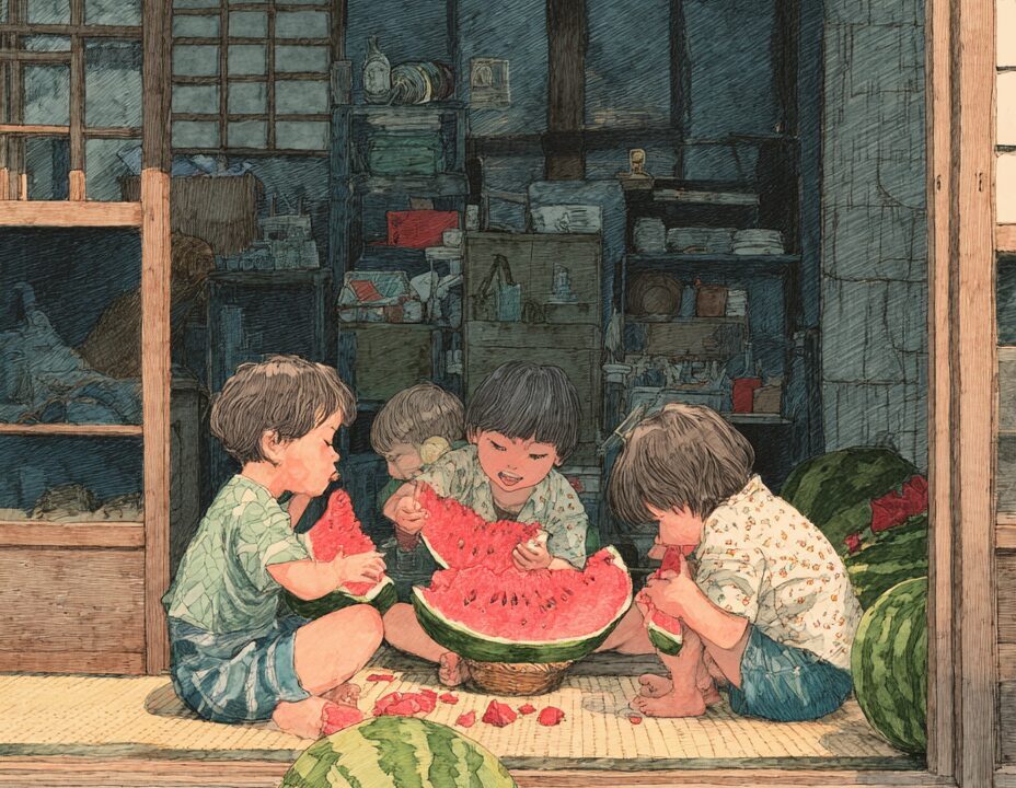 スイカを食べている風景(レトロ)の塗り絵|無料塗り絵プリント/高齢者用