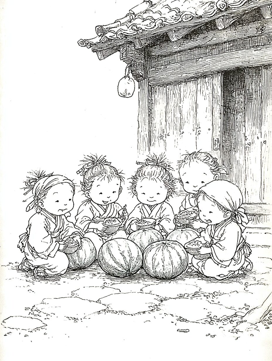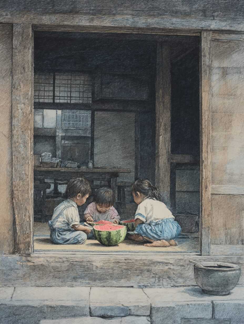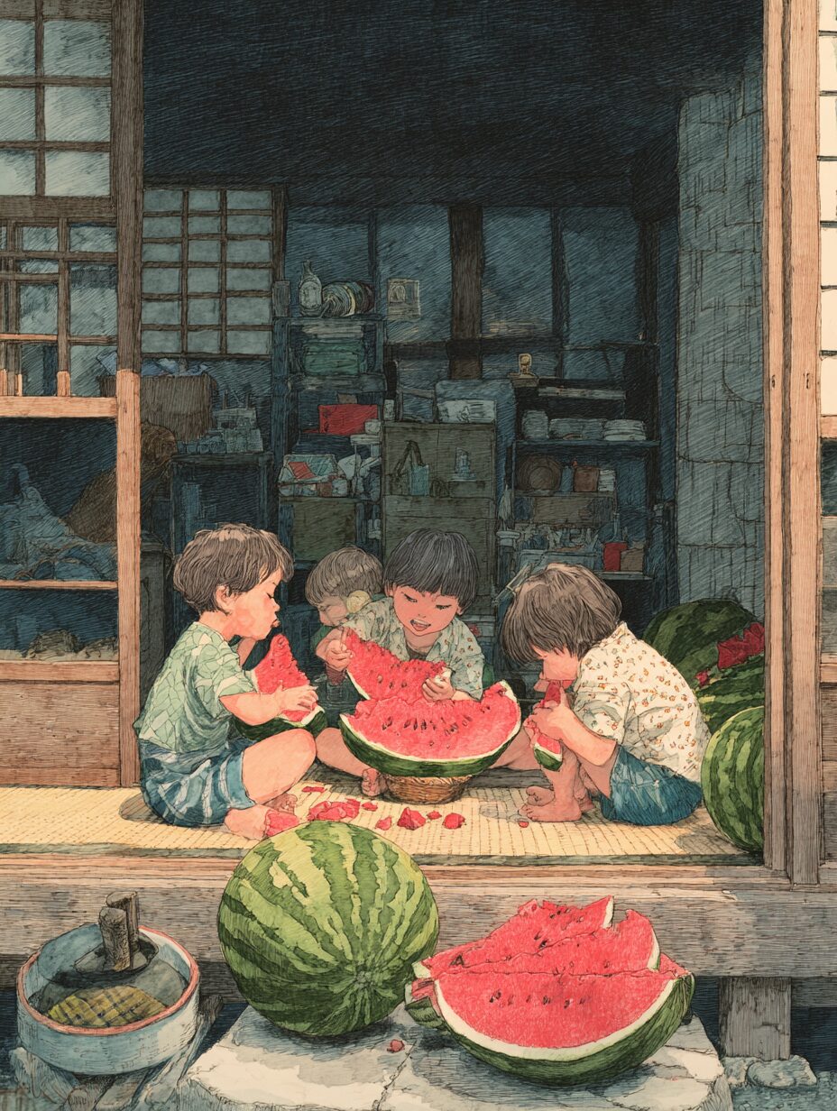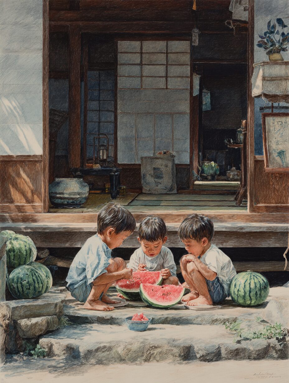 無料塗り絵:スイカを食べている風景(レトロ)(大人の塗り絵)