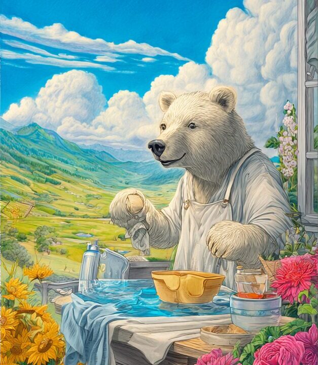 無料塗り絵:洗濯ものをする虎と熊(大人の塗り絵)