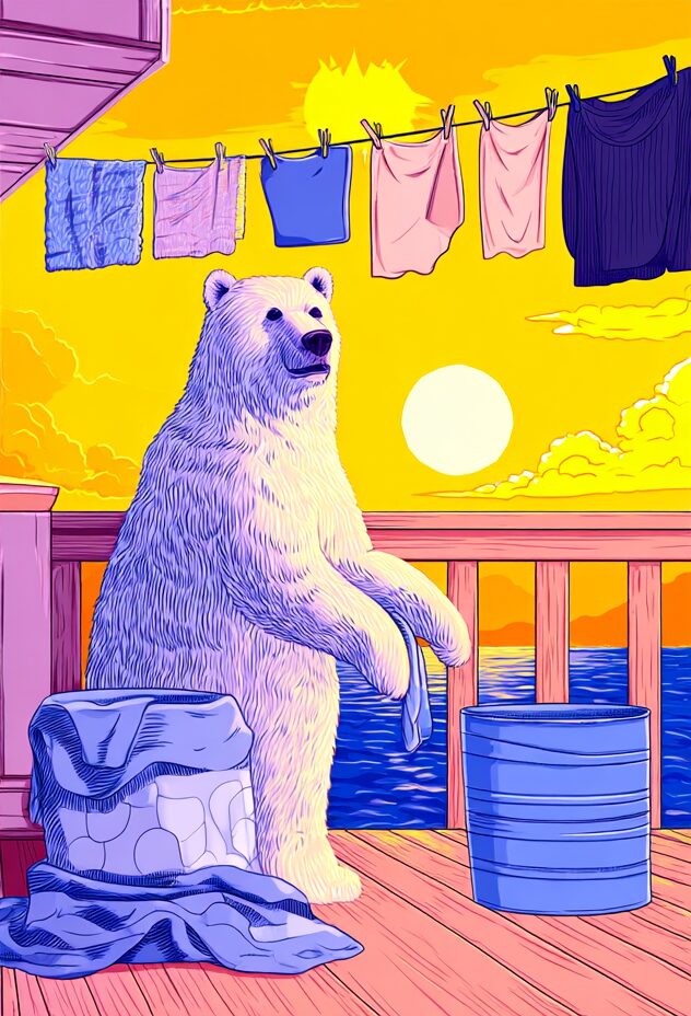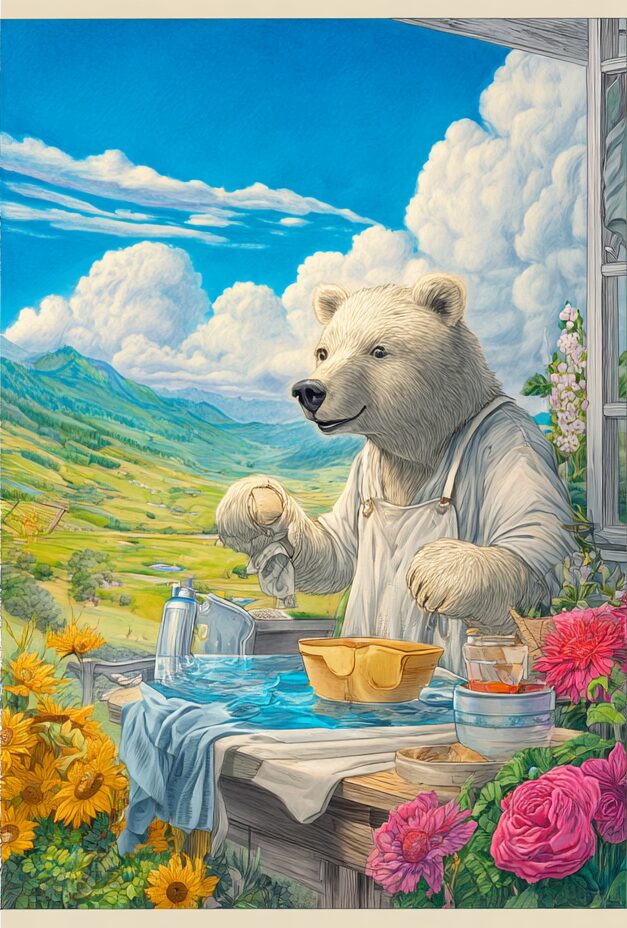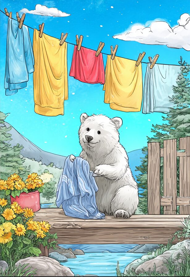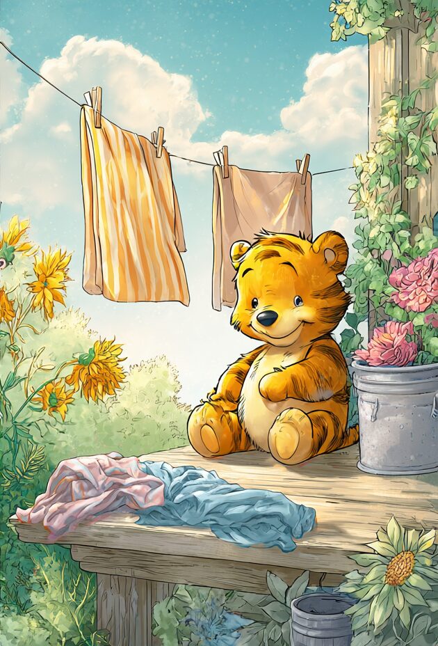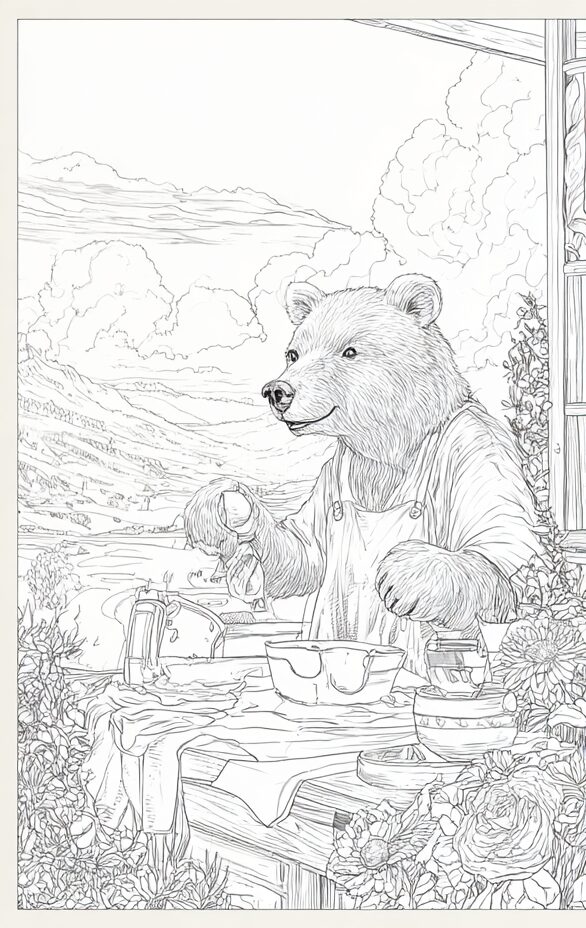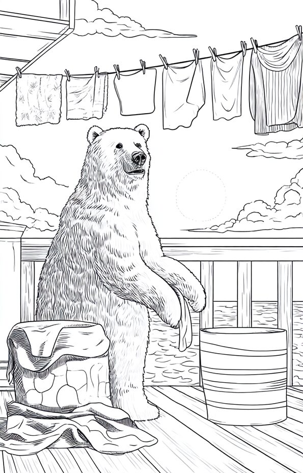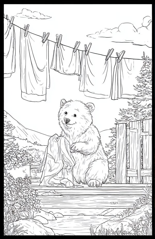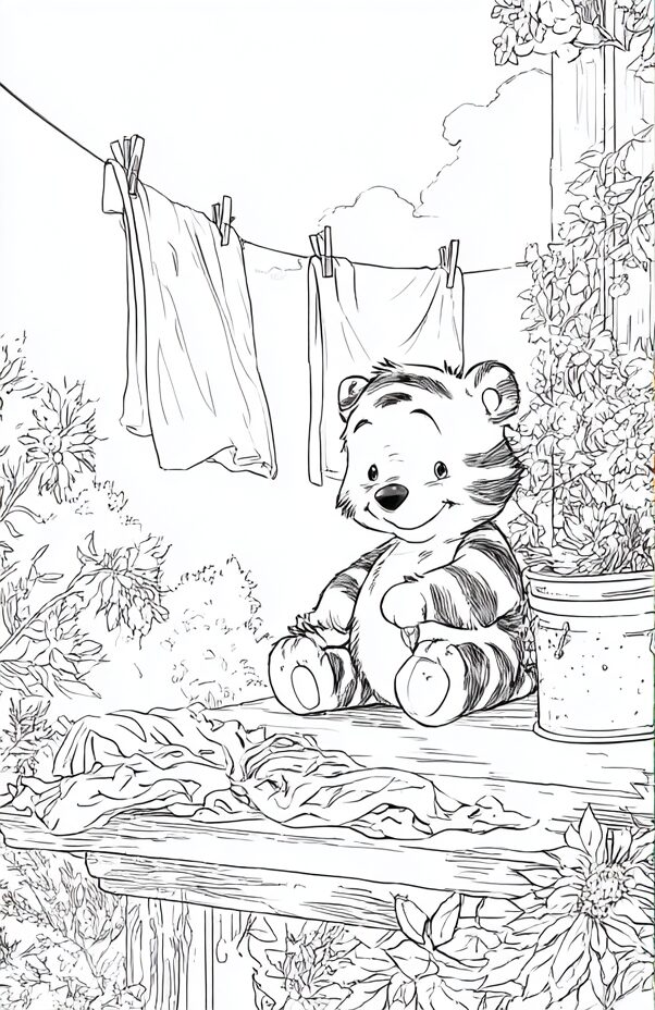 無料塗り絵:洗濯ものをする虎と熊(大人の塗り絵)