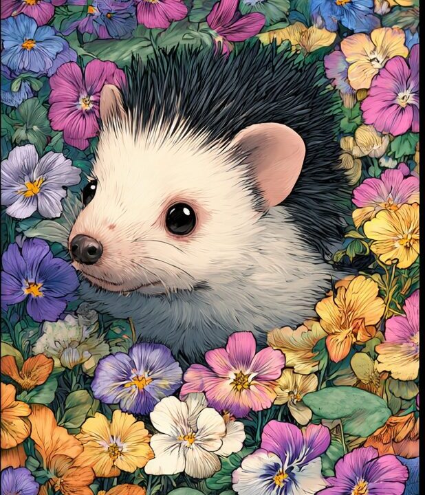 無料塗り絵:スミレの花とはりねずみ(大人の塗り絵)