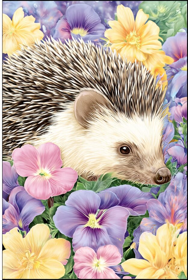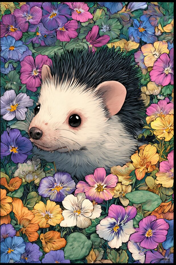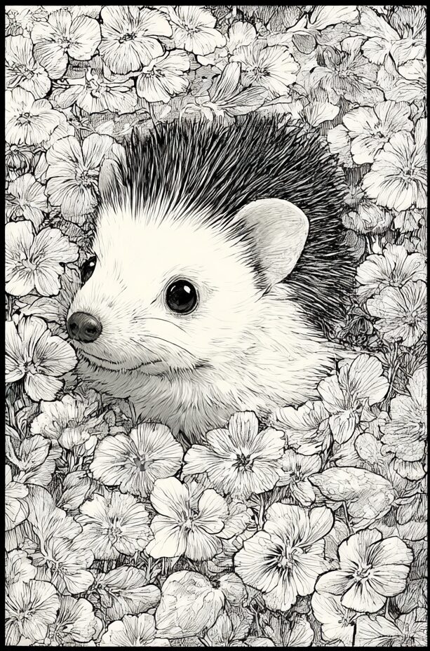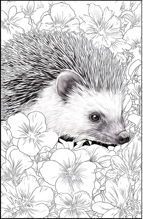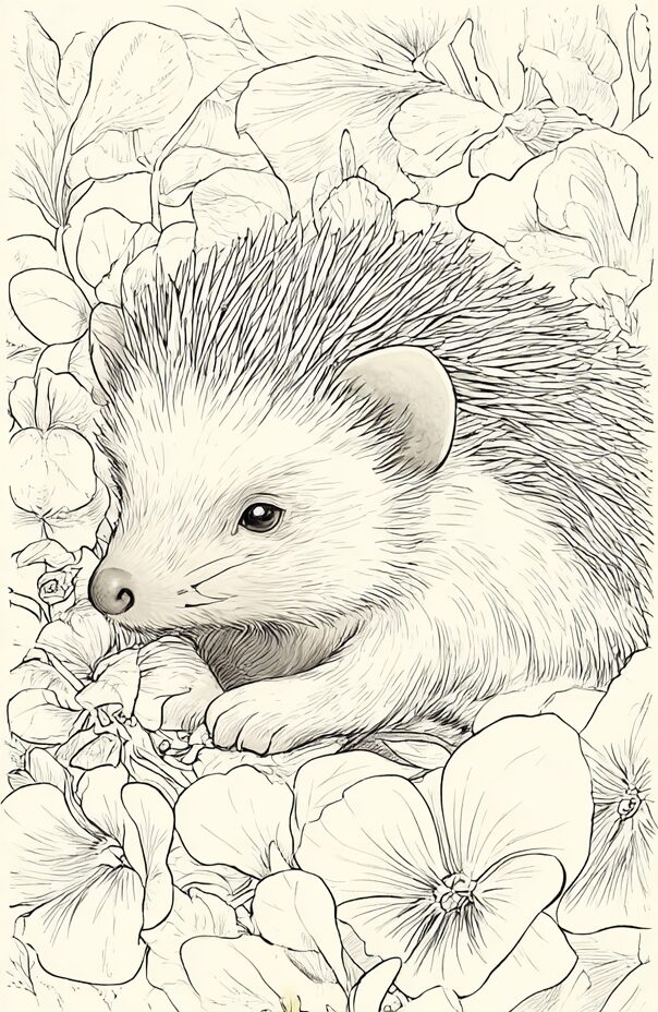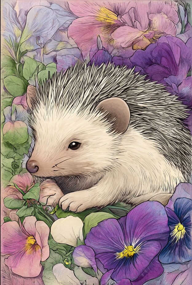 無料塗り絵:スミレの花とはりねずみ(大人の塗り絵)
